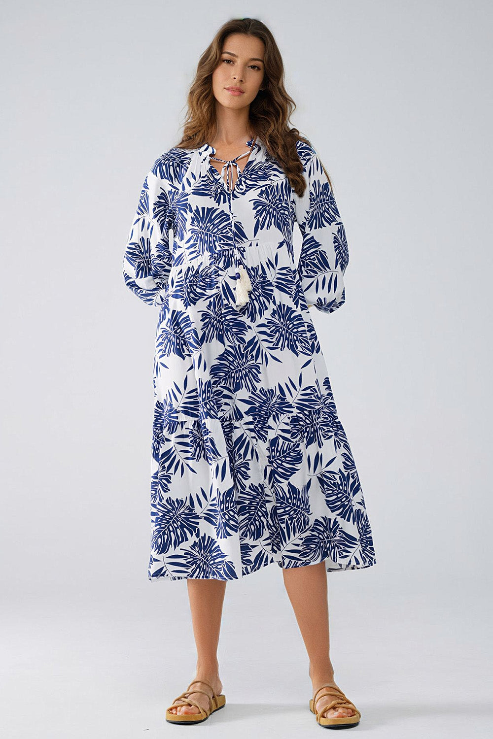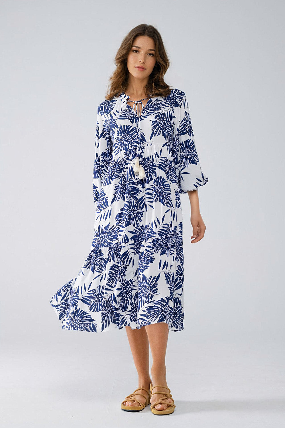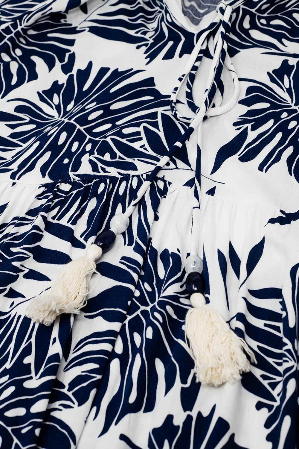 Robe longue boho à manches ballon et imprimé feuilles en bleu foncé et blanc